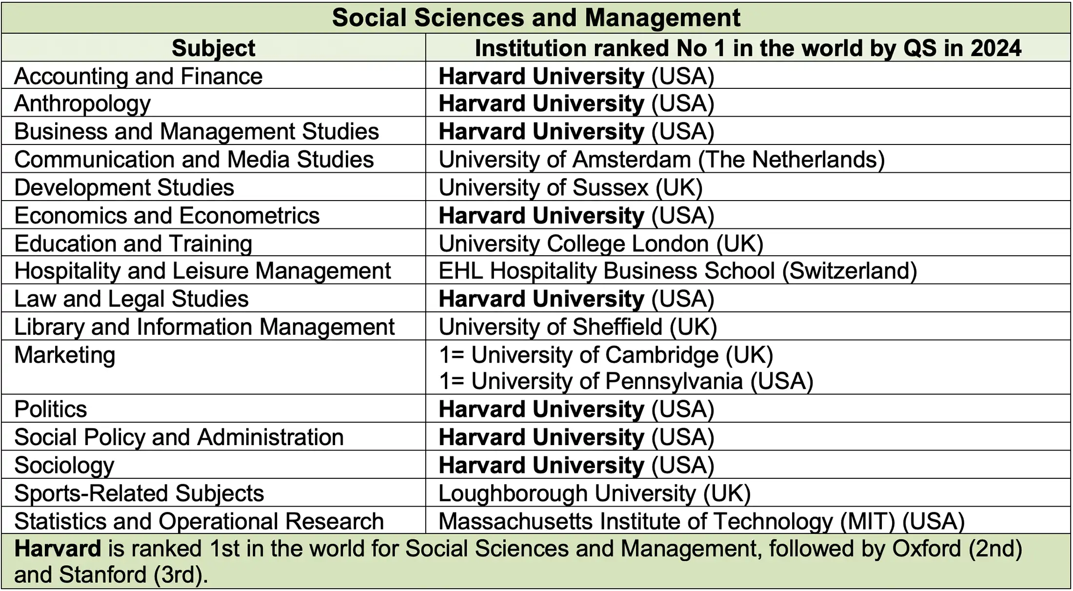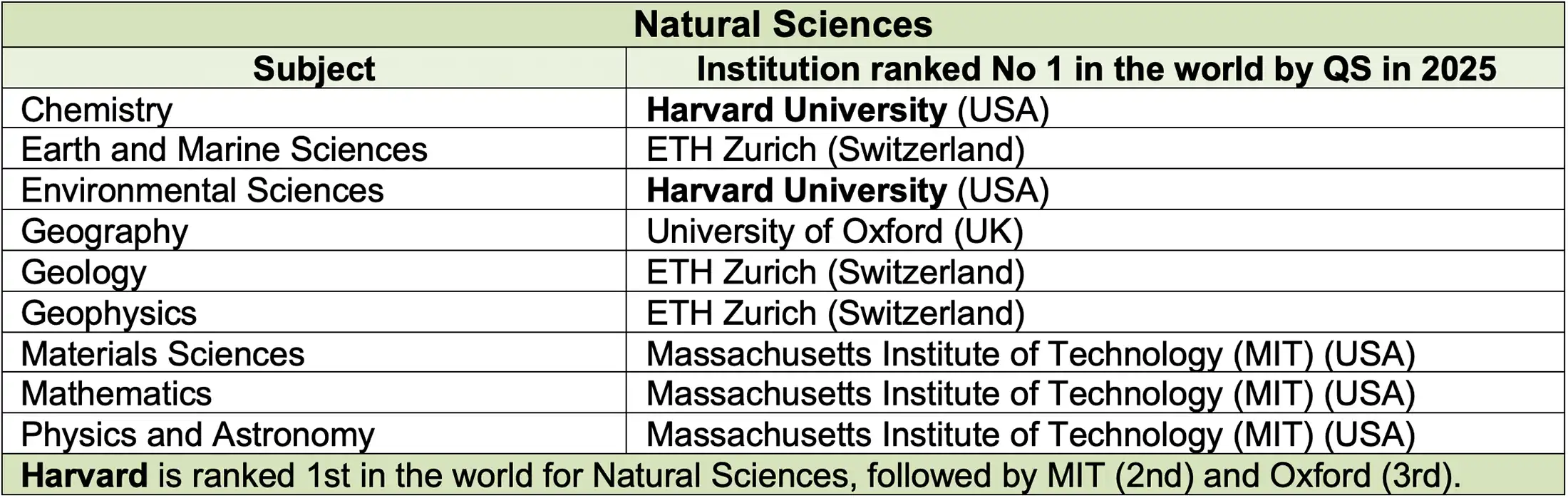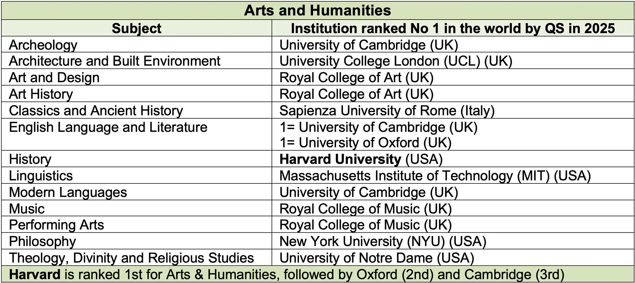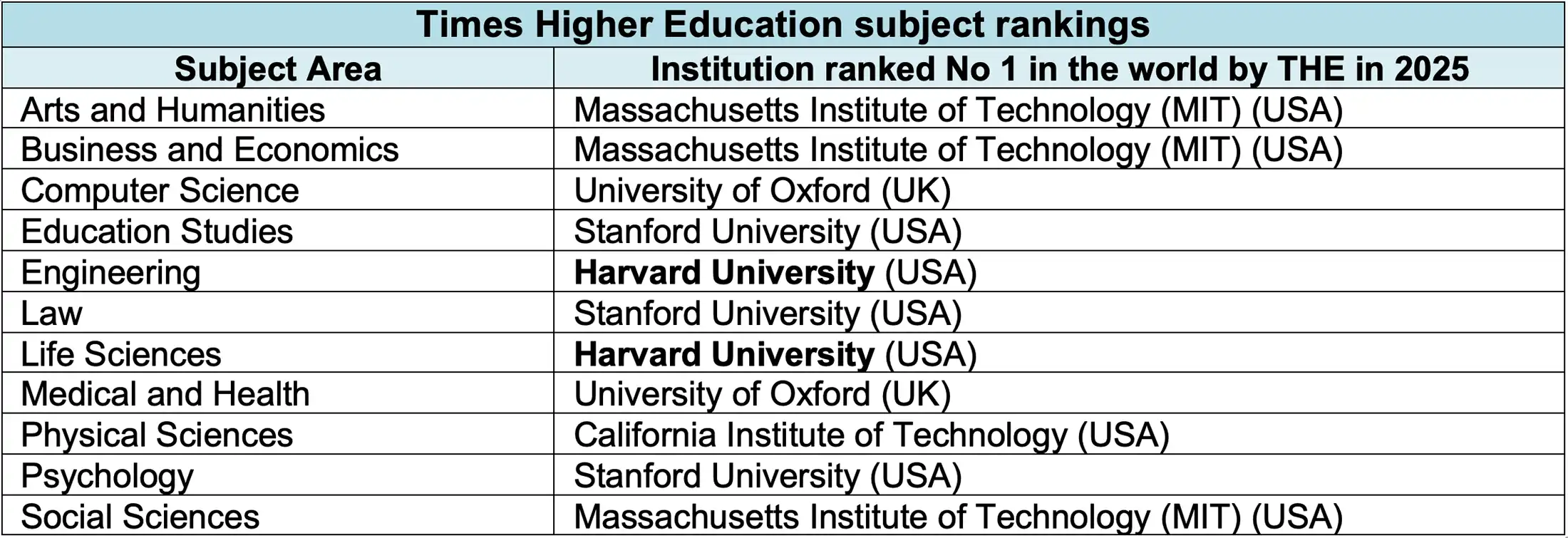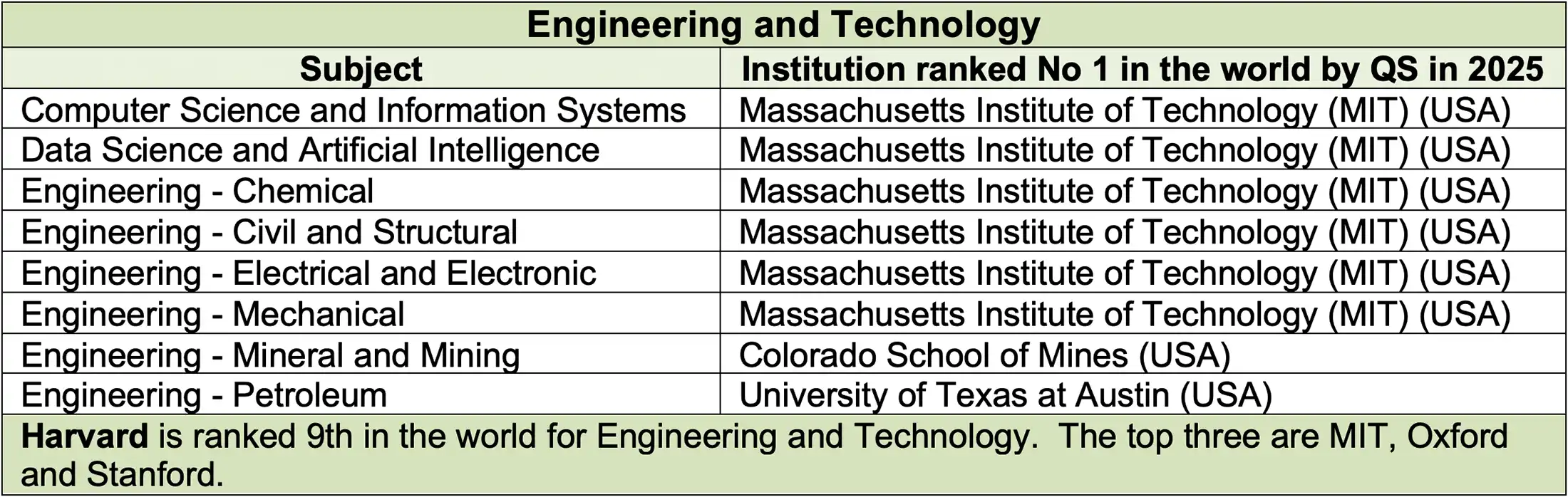 The universities which QS ranked the highest in each subject in 2025 (the latest year for which figures are available) are shown below, classified under five broad subject areas.