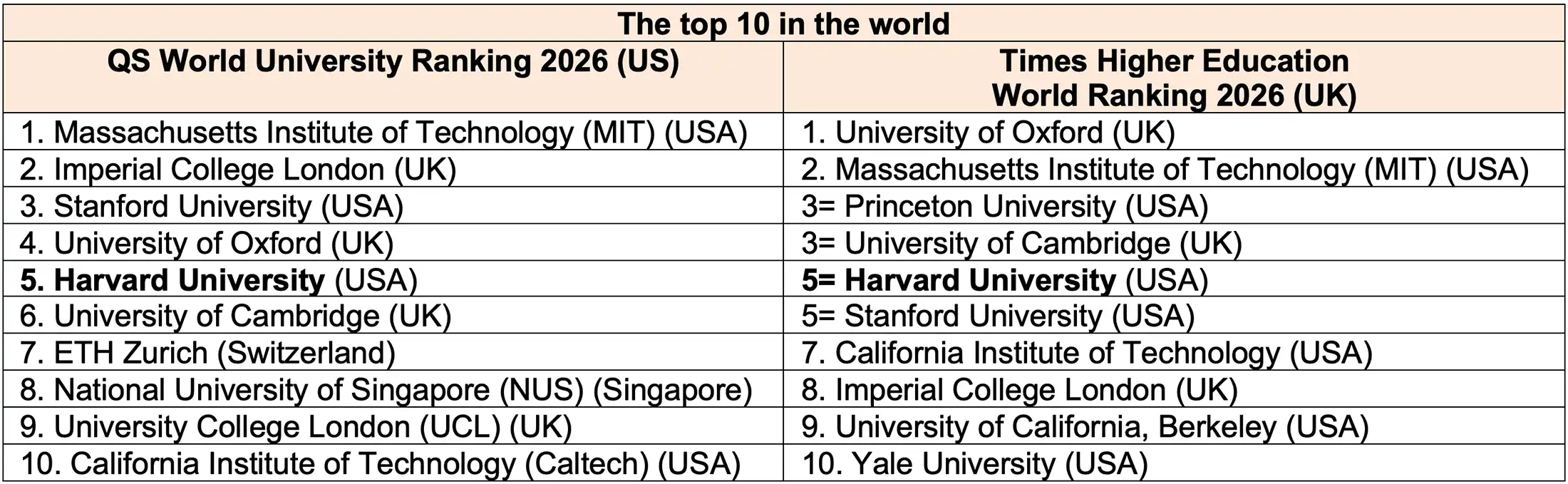 The top universities in the world are ranked slightly differently by the two websites. The entire top ten on the Times Higher Education World Ranking are from the US or UK, whereas universities from Switzerland and Singapore are ranked 7th and 8th in the QS top ten. Harvard is ranked 5th in both the QS and THE ranking systems.